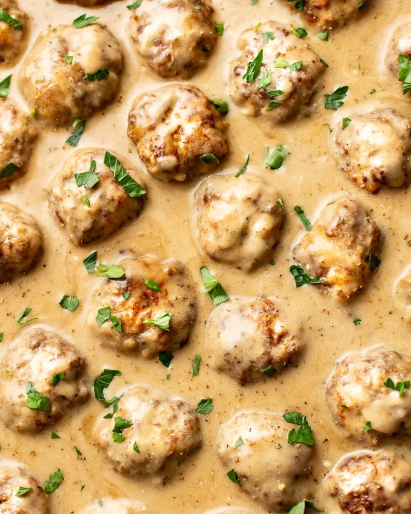 • Simmer Meatballs: Add browned meatballs to the gravy and simmer gently for 10–15 minutes without boiling hard.
